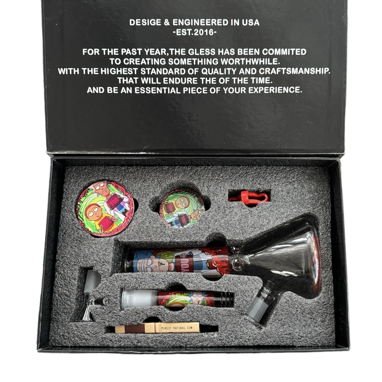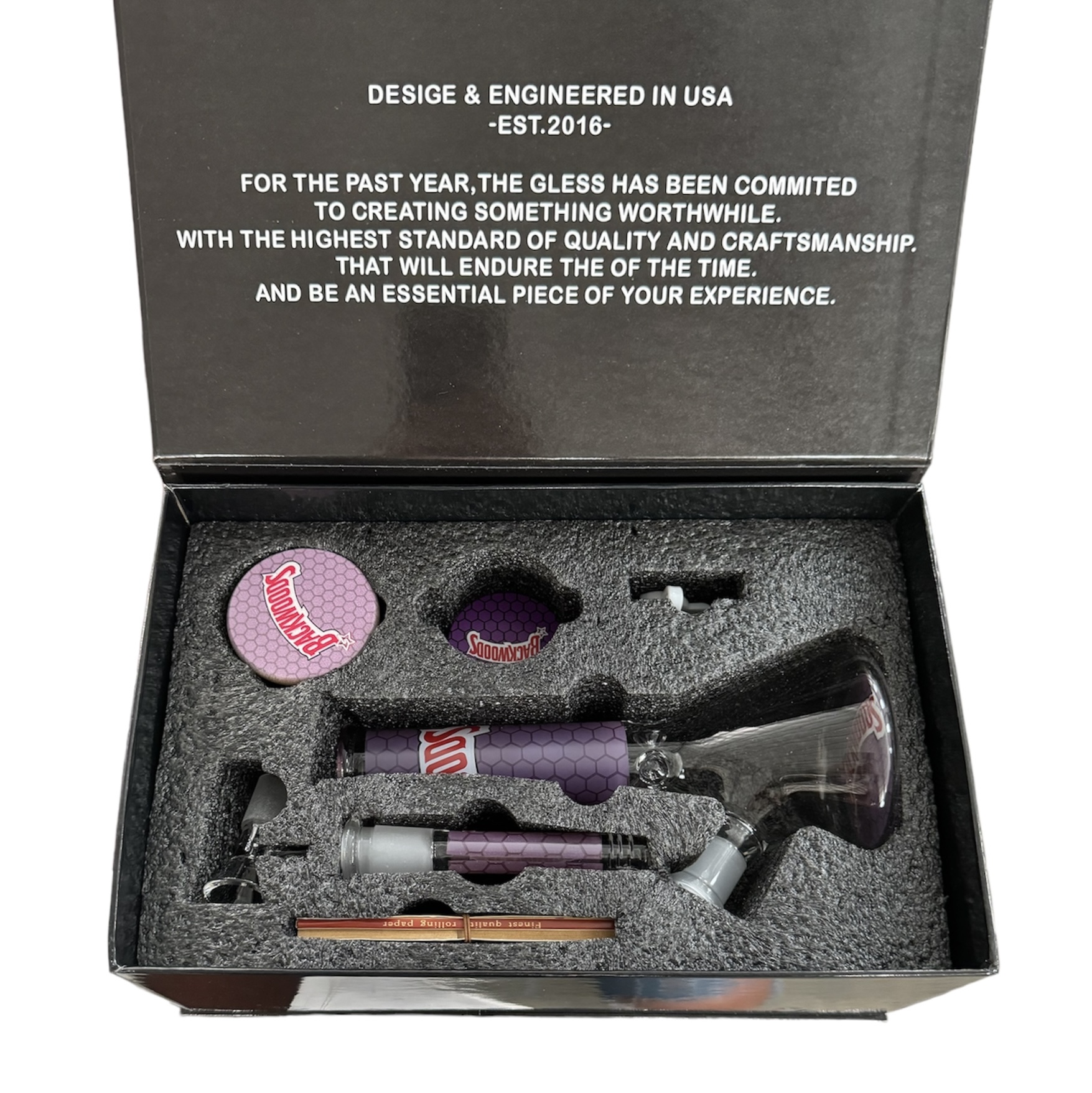 Includes: glass water pipe, glass insert, glass bowl, glass suction seal jar, metal grinder, insert adjuster, rolling paper.